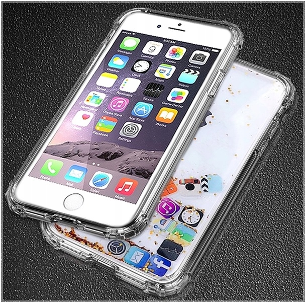 Gumowa, kobieca obudowa, która nada Twojemu urządzeniu oryginalności, a jednocześnie ochroni je przed uszkodzeniami. Efektowne połączenie barw wraz z mieniącymi się drobinkami brokatu i dobrze znanymi ikonami z iPhone. Płynny brokat zmienia swoje położenie w zależności od kąta pod którym znajduje się telefon.