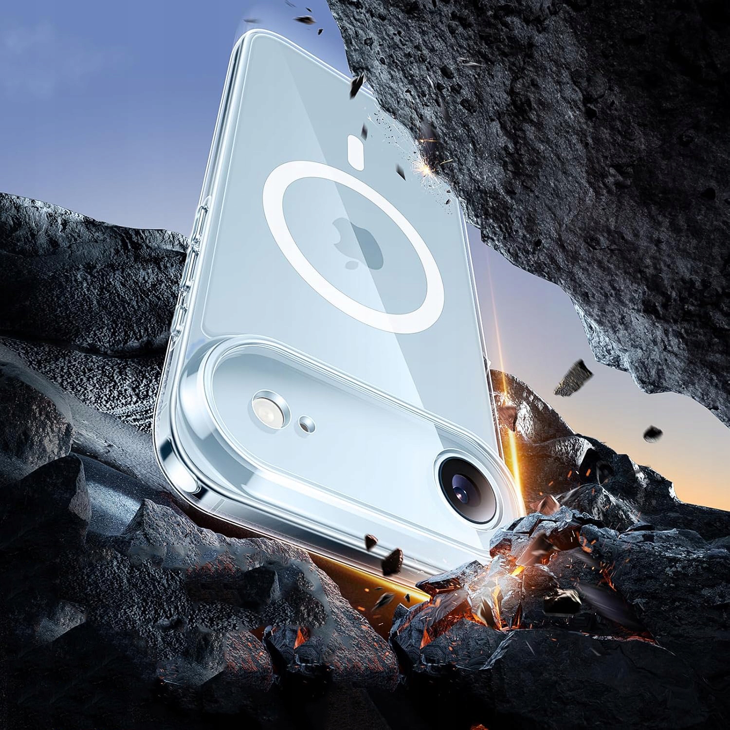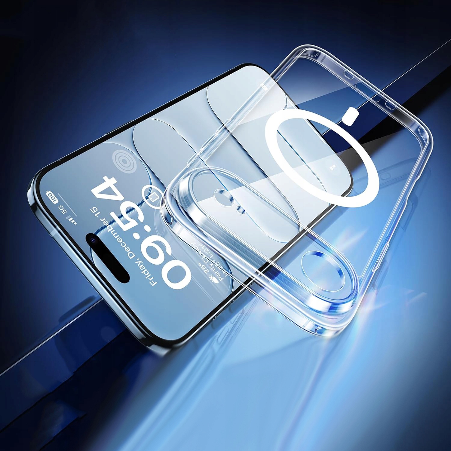 Akcesorium wykonane z przezroczystego silikonu z wkładką magnetyczną ułatwiającą wygodne użytkowanie urządzeń MagSafe.
