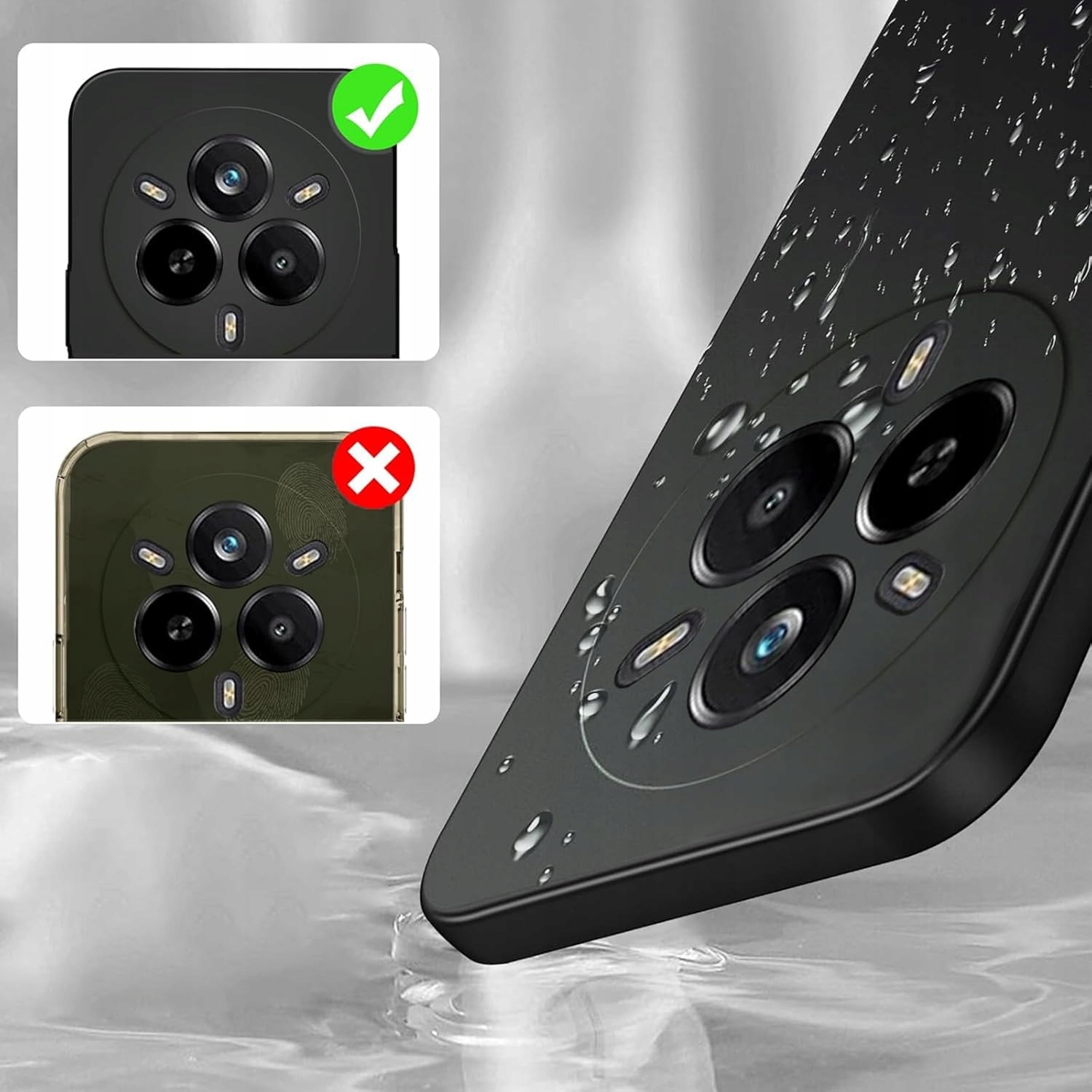 - Materiał dolnej części składa się z płynnego silikonu, który umożliwia łatwą instalację. Etui można łatwo założyć od dołu.