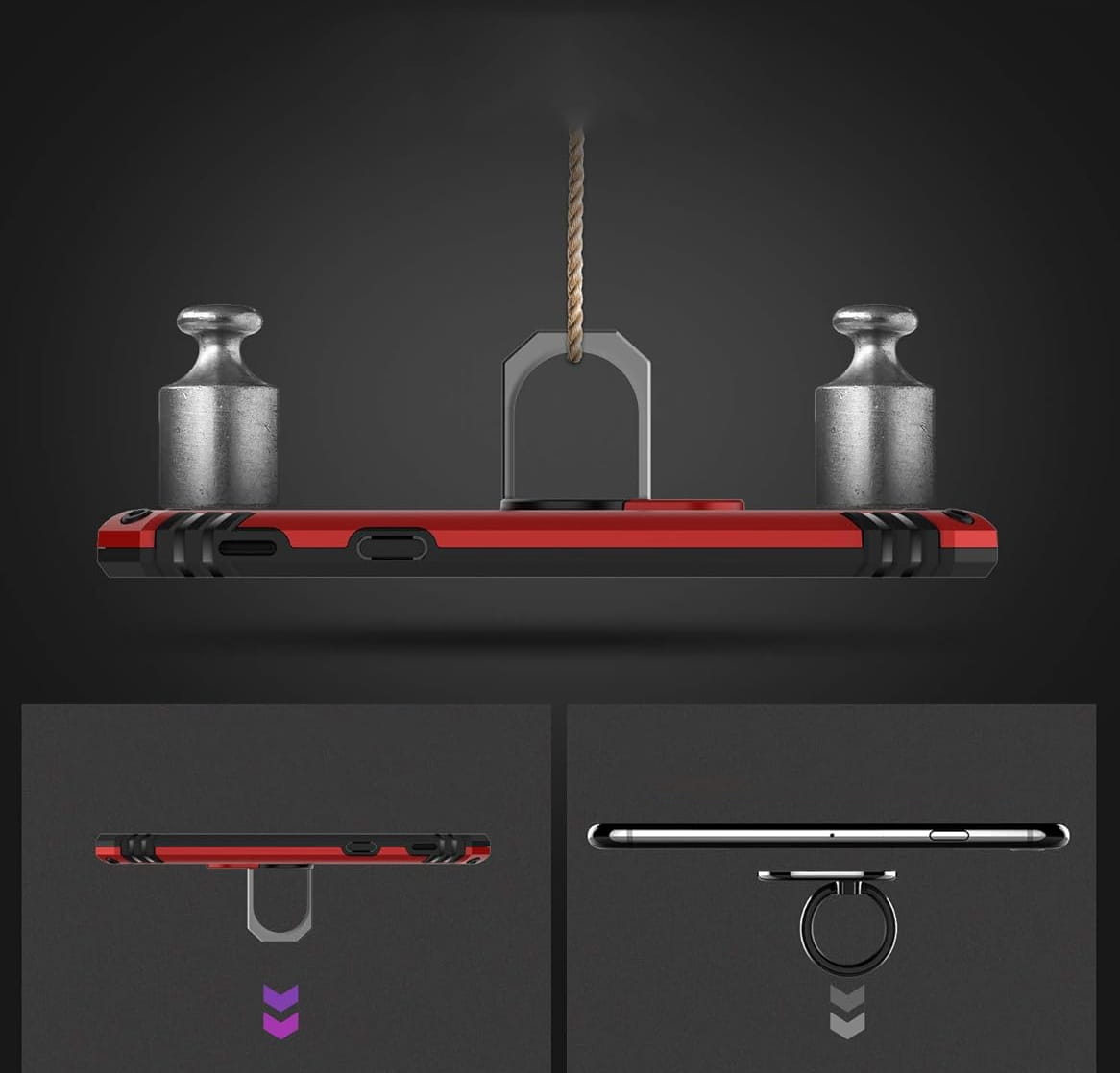 Pancerne etui to konstrukcja dwa w jednym z PC i TPU, z obudową PC, która jest mocna, trwała i odporna na wstrząsy , podszyte TPU, dobra elastyczność. Posiada pierścień do trzymania telefonu oraz blaszkę, dzięki czemu etui jest idealne do używania z magnetycznym uchwytem samochodowym.