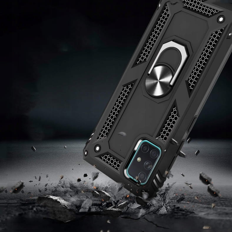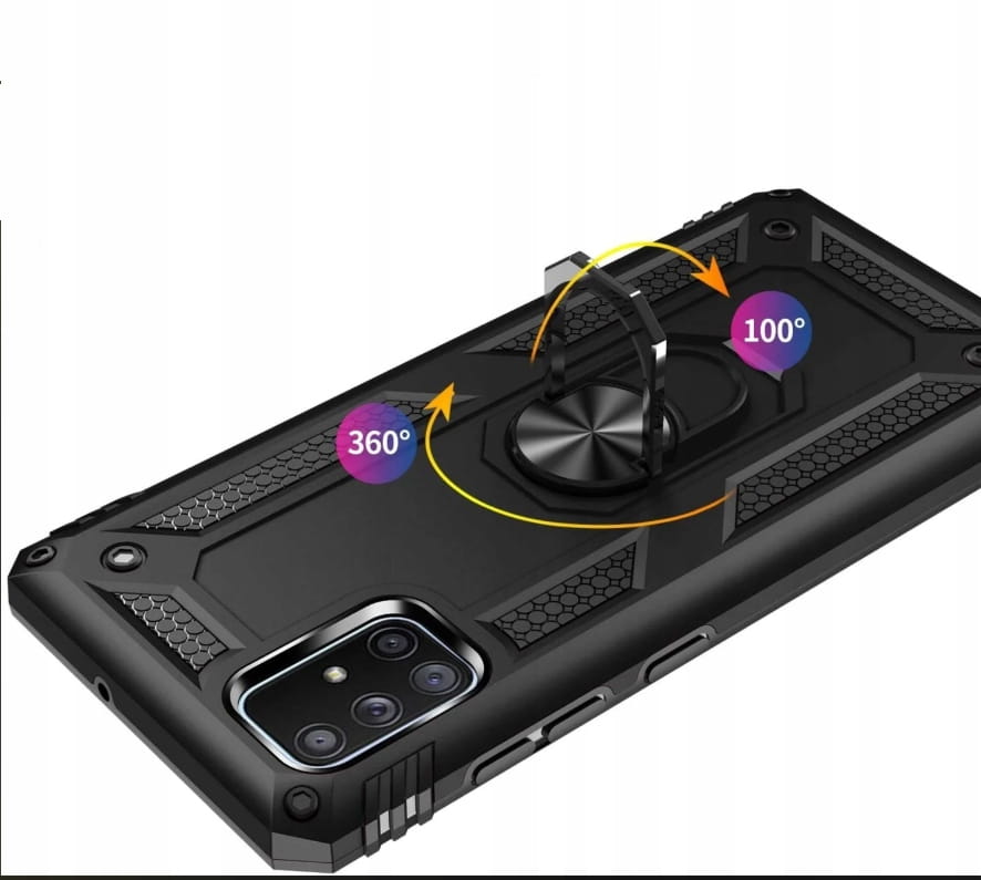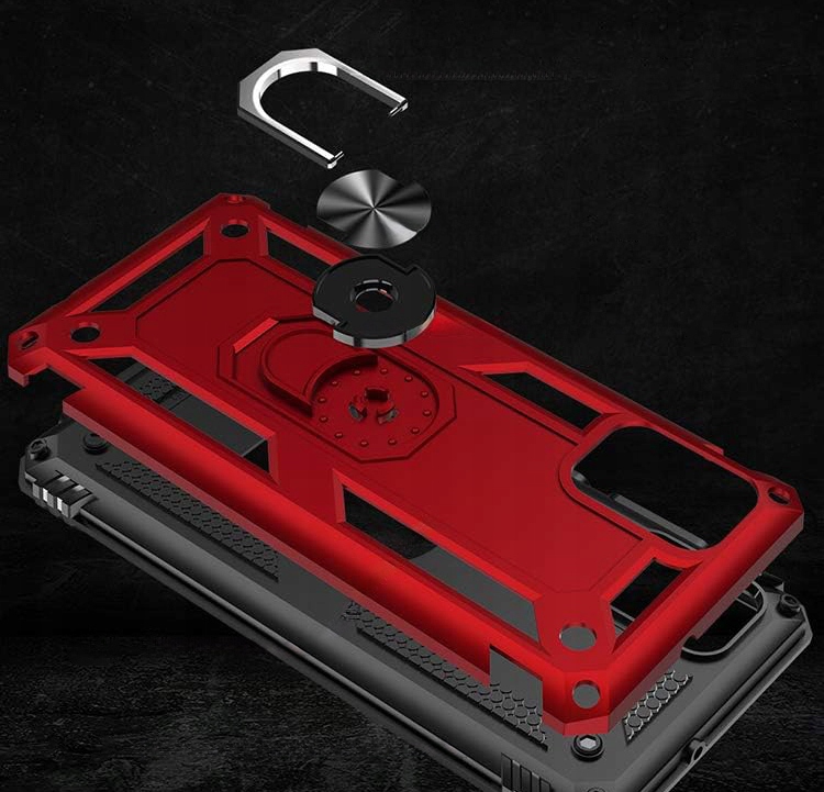 Pancerne etui to konstrukcja dwa w jednym z PC i TPU, z obudową PC, która jest mocna, trwała i odporna na wstrząsy , podszyte TPU, dobra elastyczność. Posiada pierścień do trzymania telefonu oraz blaszkę, dzięki czemu etui jest idealne do używania z magnetycznym uchwytem samochodowym.