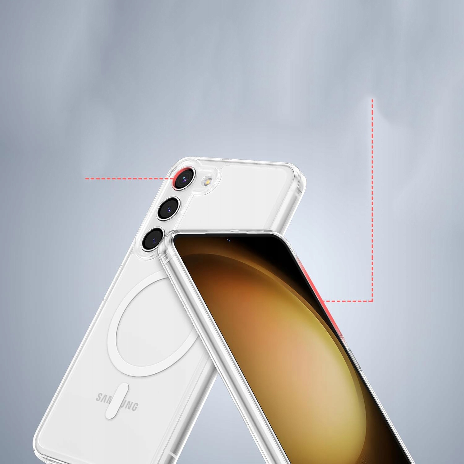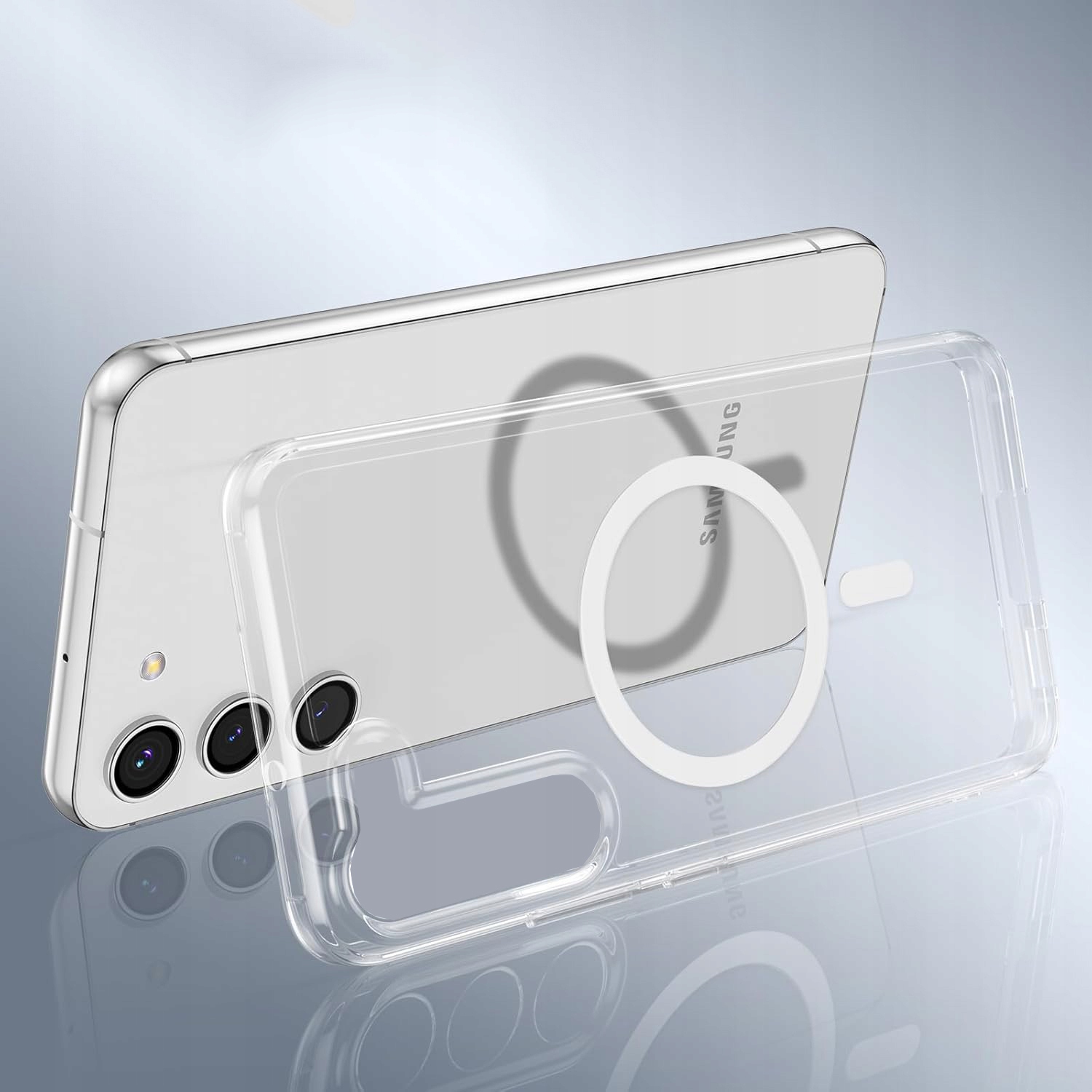 Akcesorium wykonane z przezroczystego silikonu z wkładką magnetyczną ułatwiającą wygodne użytkowanie urządzeń MagSafe.