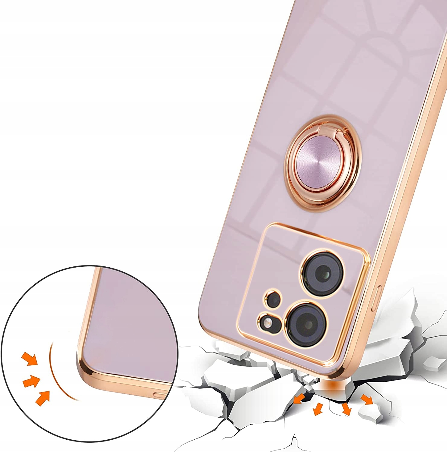 Wbudowany pierścień obrotowy 360° pełni funkcje podstawki, uchwytu i pomocy podczas robienia selfie. Odporne na wstrząsy, skutecznie amortyzuje uderzenia spadającego telefonu.