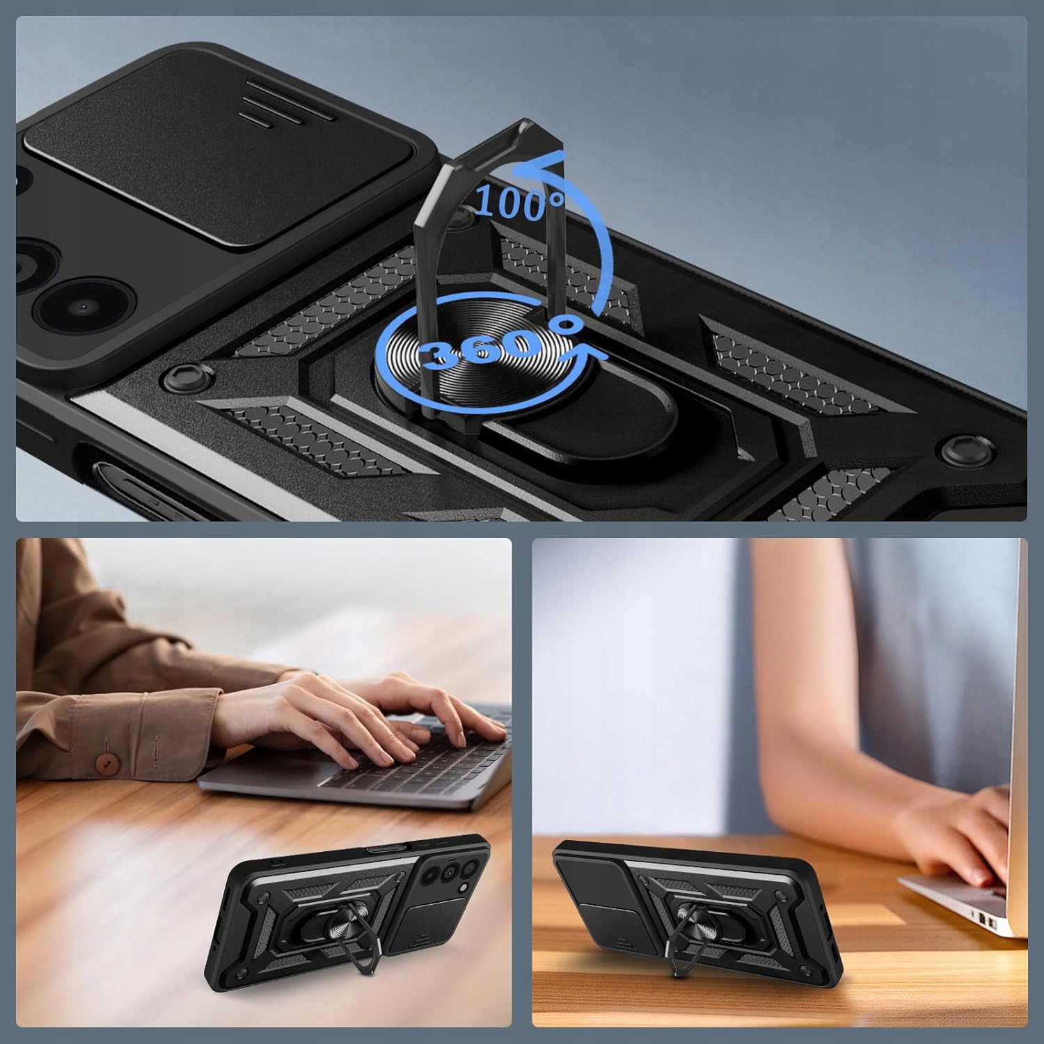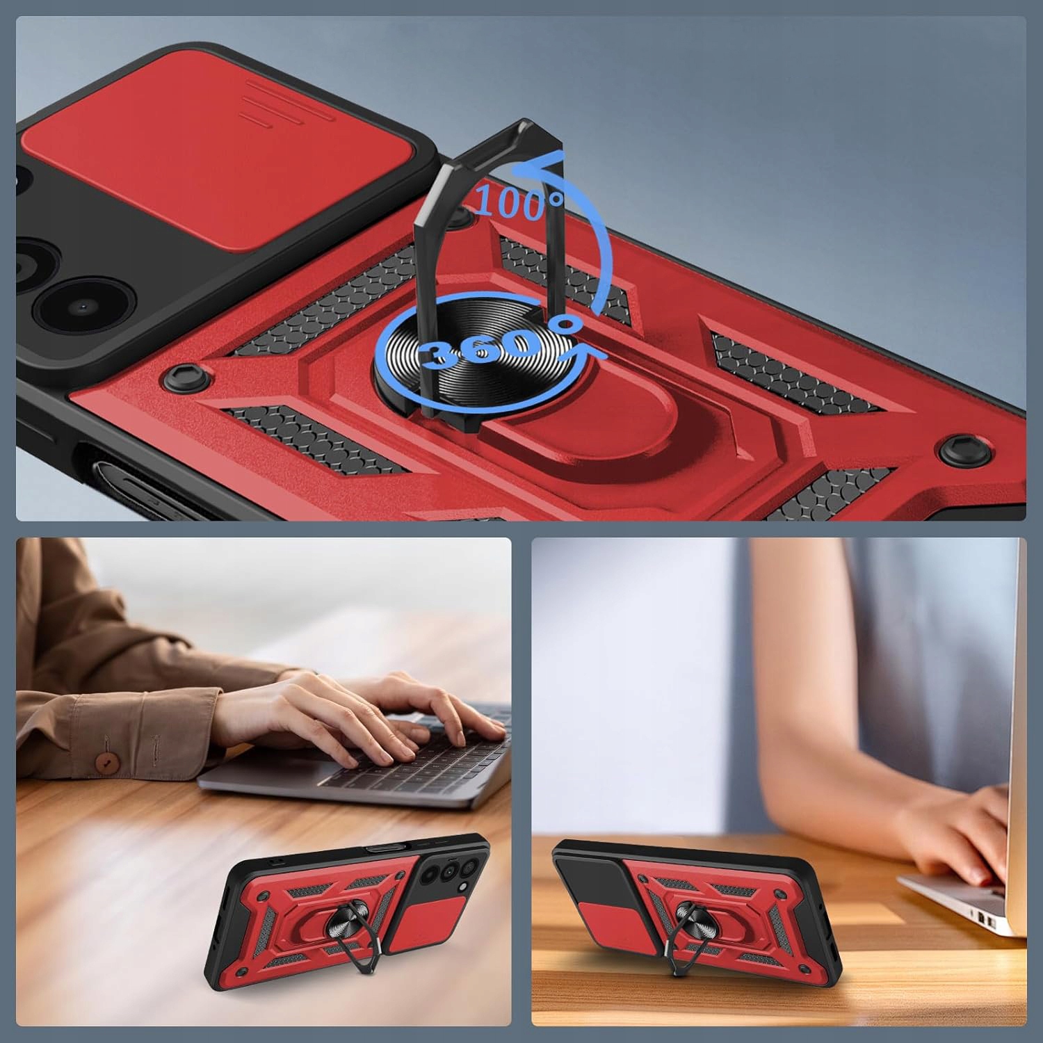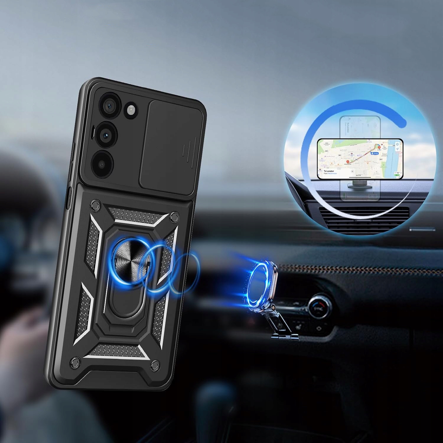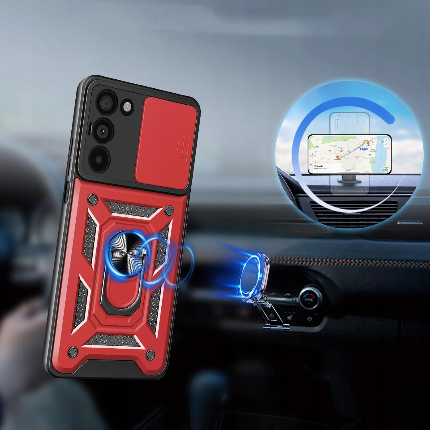 Pancerne etui to konstrukcja dwa w jednym z PC i TPU, z obudową PC, która jest mocna, trwała i odporna na wstrząsy , podszyte TPU, dobra elastyczność. Posiada pierścień do trzymania telefonu oraz blaszkę, dzięki czemu etui jest idealne do używania z magnetycznym uchwytem samochodowym.