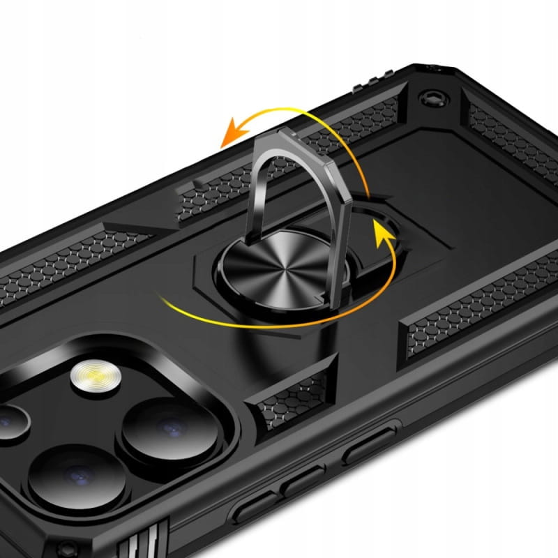 Pancerne etui to konstrukcja dwa w jednym z PC i TPU, z obudową PC, która jest mocna, trwała i odporna na wstrząsy , podszyte TPU, dobra elastyczność. Posiada pierścień do trzymania telefonu oraz blaszkę, dzięki czemu etui jest idealne do używania z magnetycznym uchwytem samochodowym.