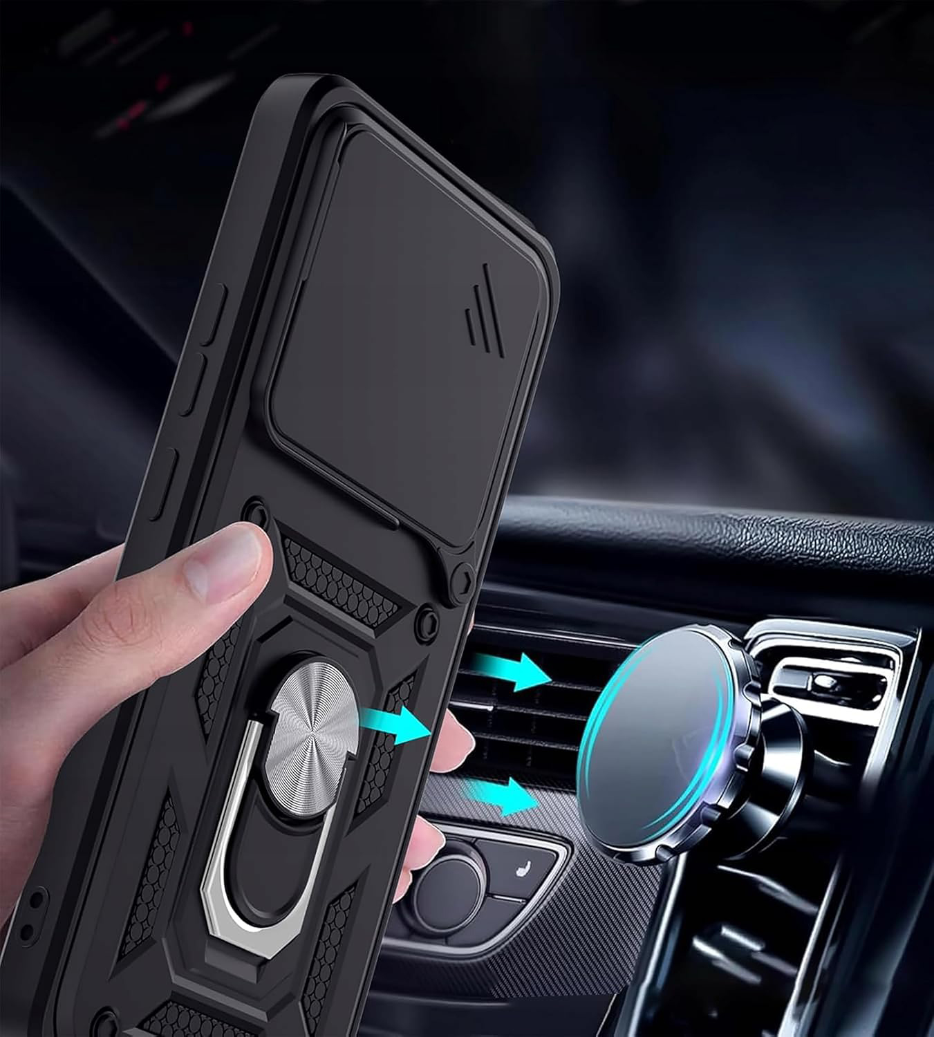 Pancerne etui to konstrukcja dwa w jednym z PC i TPU, z obudową PC, która jest mocna, trwała i odporna na wstrząsy , podszyte TPU, dobra elastyczność. Posiada pierścień do trzymania telefonu oraz blaszkę, dzięki czemu etui jest idealne do używania z magnetycznym uchwytem samochodowym.