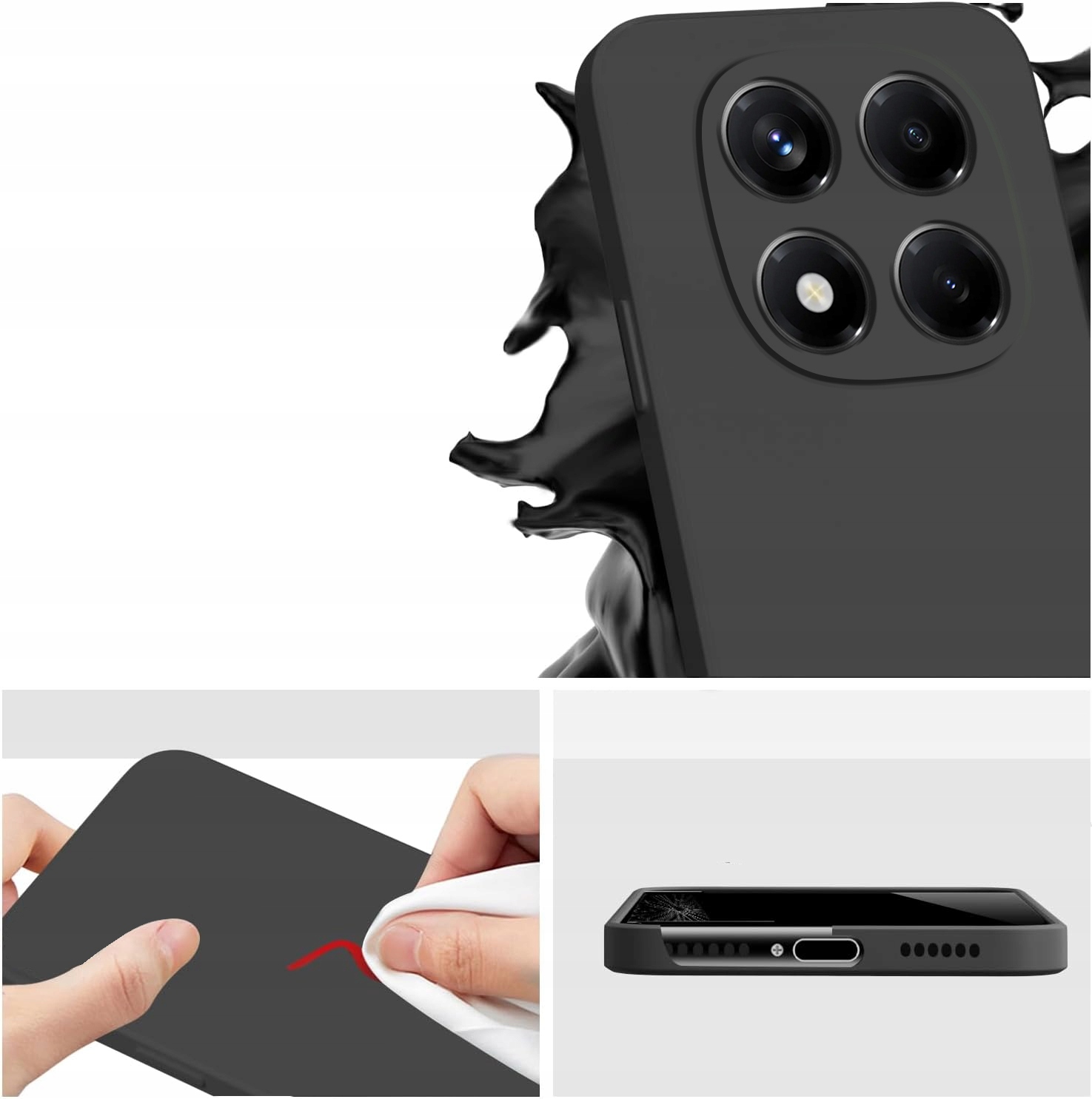- Materiał dolnej części składa się z płynnego silikonu, który umożliwia łatwą instalację. Etui można łatwo założyć od dołu.
