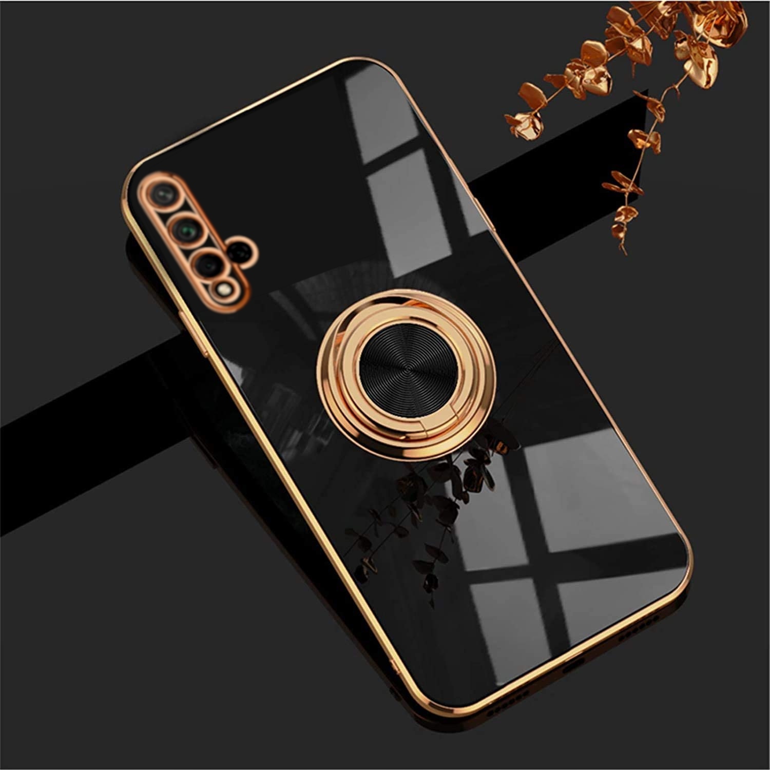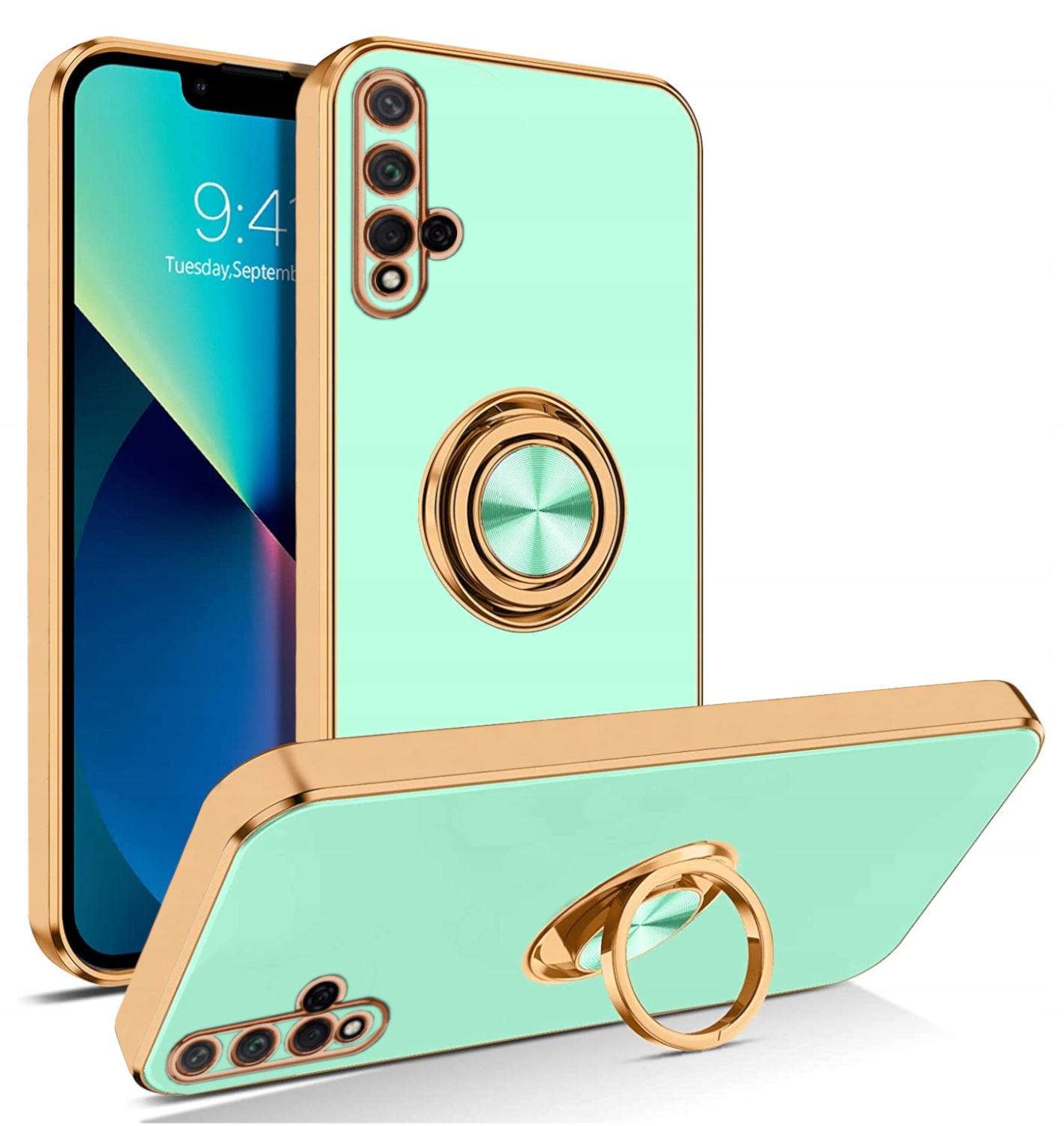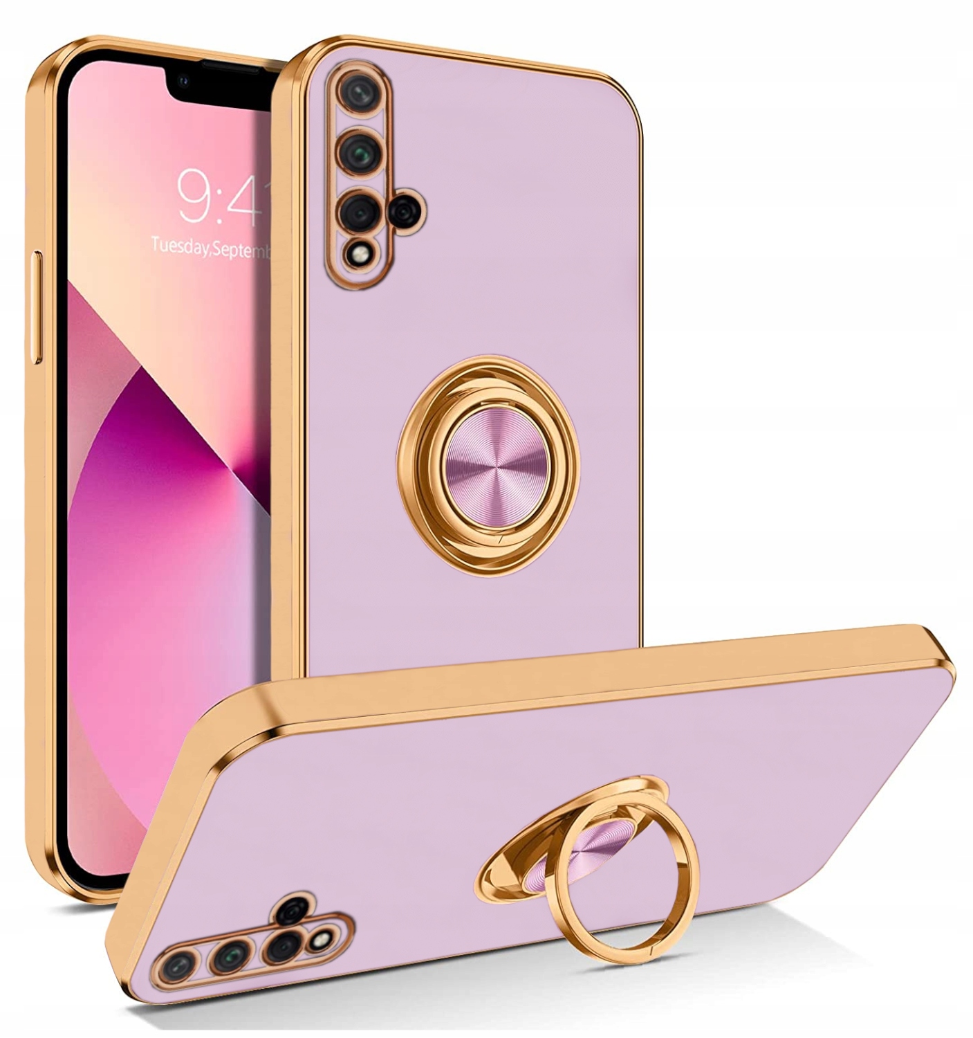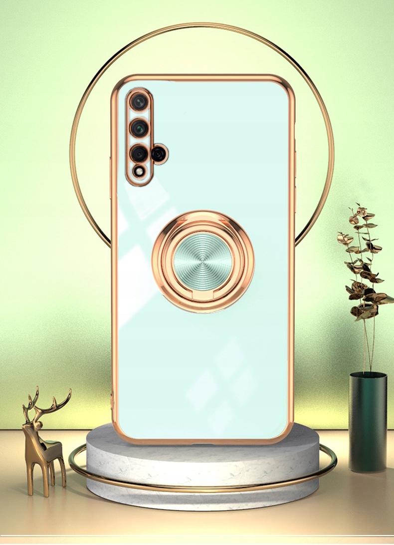 Silikonowa obudowa jest wykonana z cienkich materiałów przyjaznych dla środowiska. Etui jest gładkie w dotyku, błyszczący wzór powierzchni i złote krawędzie nadają telefonowi inny wygląd i zapewniają pełną ochronę telefonu. Wbudowany pierścień obrotowy 360° pełni funkcje podstawki, uchwytu i pomocy podczas robienia selfie. Odporne na wstrząsy, skutecznie amortyzuje uderzenia spadającego telefonu.