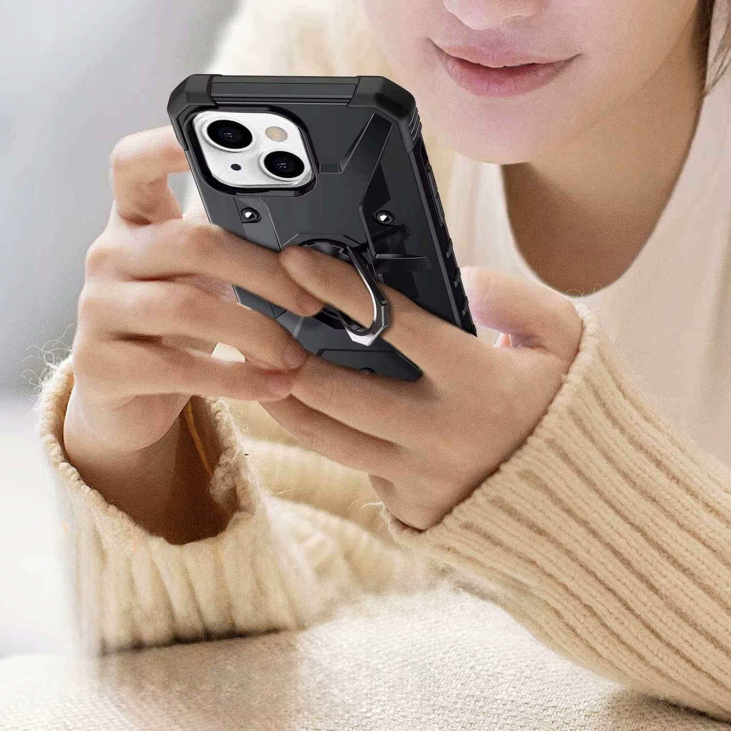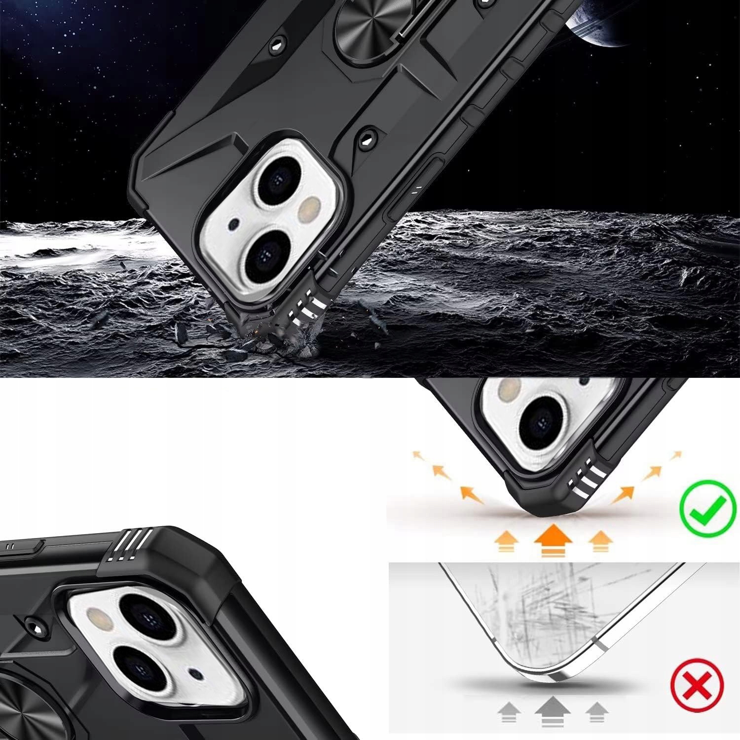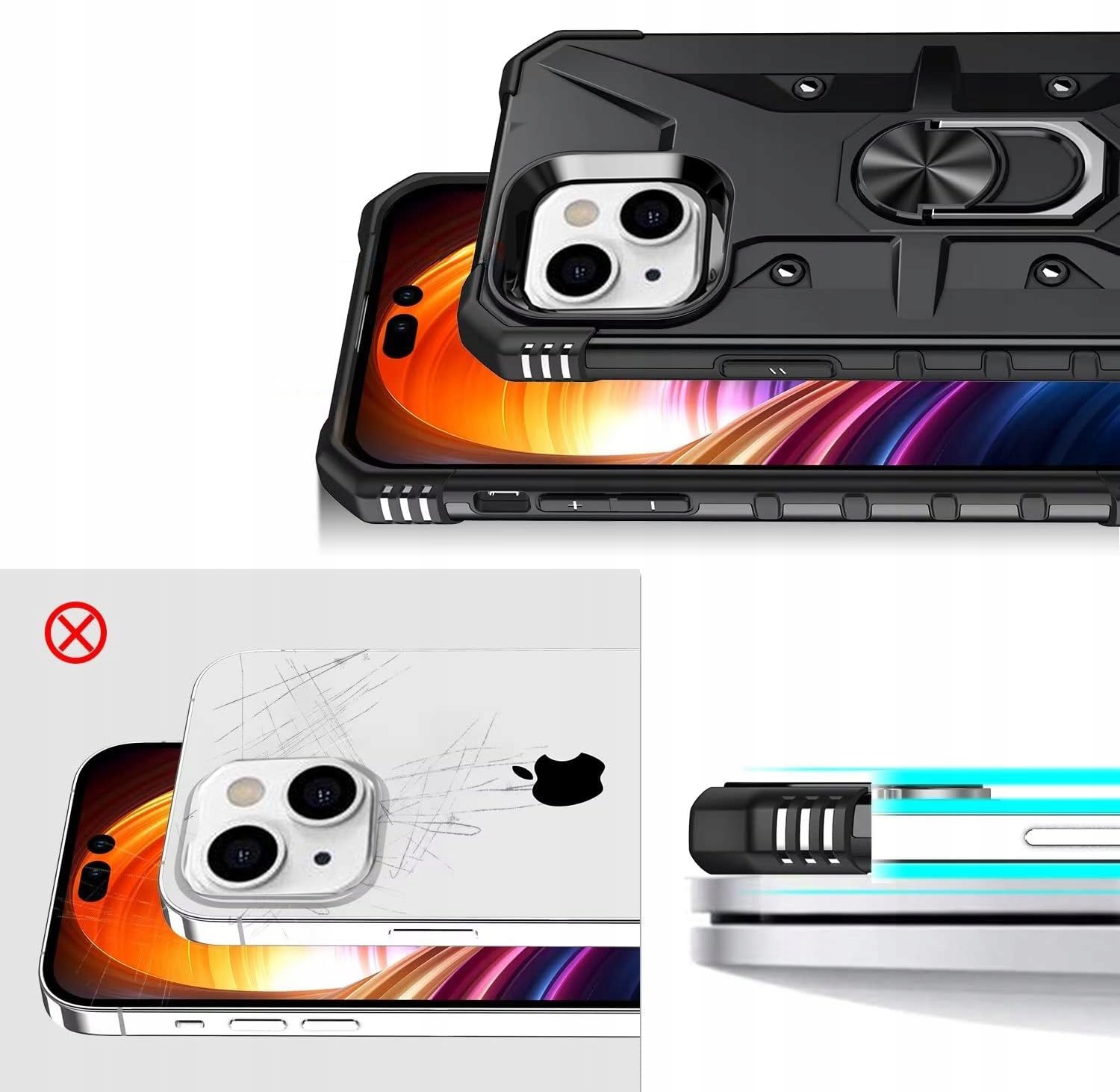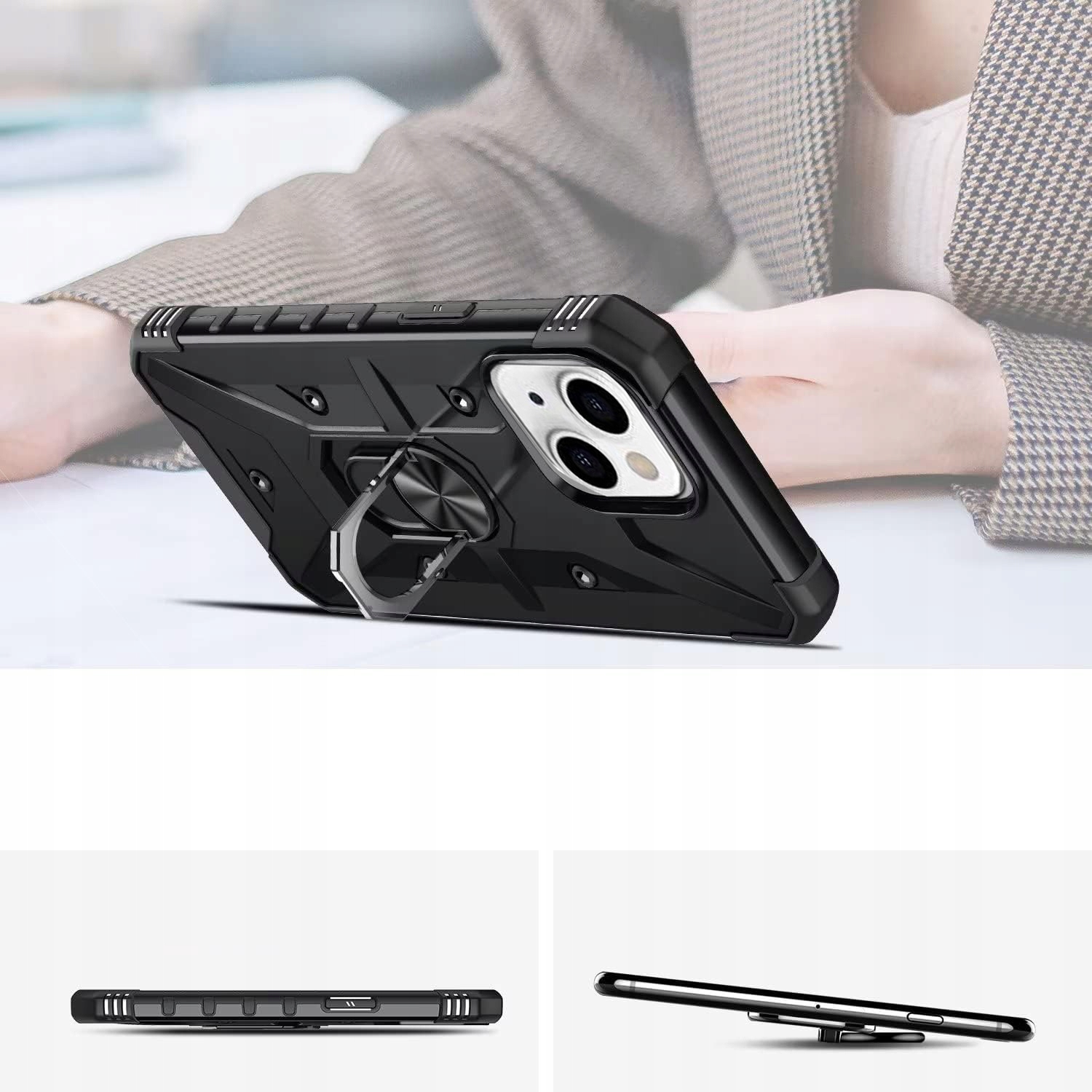 Pancerne etui to konstrukcja dwa w jednym z PC i TPU, z obudową PC, która jest mocna, trwała i odporna na wstrząsy , podszyte TPU, dobra elastyczność. Posiada pierścień do trzymania telefonu oraz blaszkę, dzięki czemu etui jest idealne do używania z magnetycznym uchwytem samochodowym.