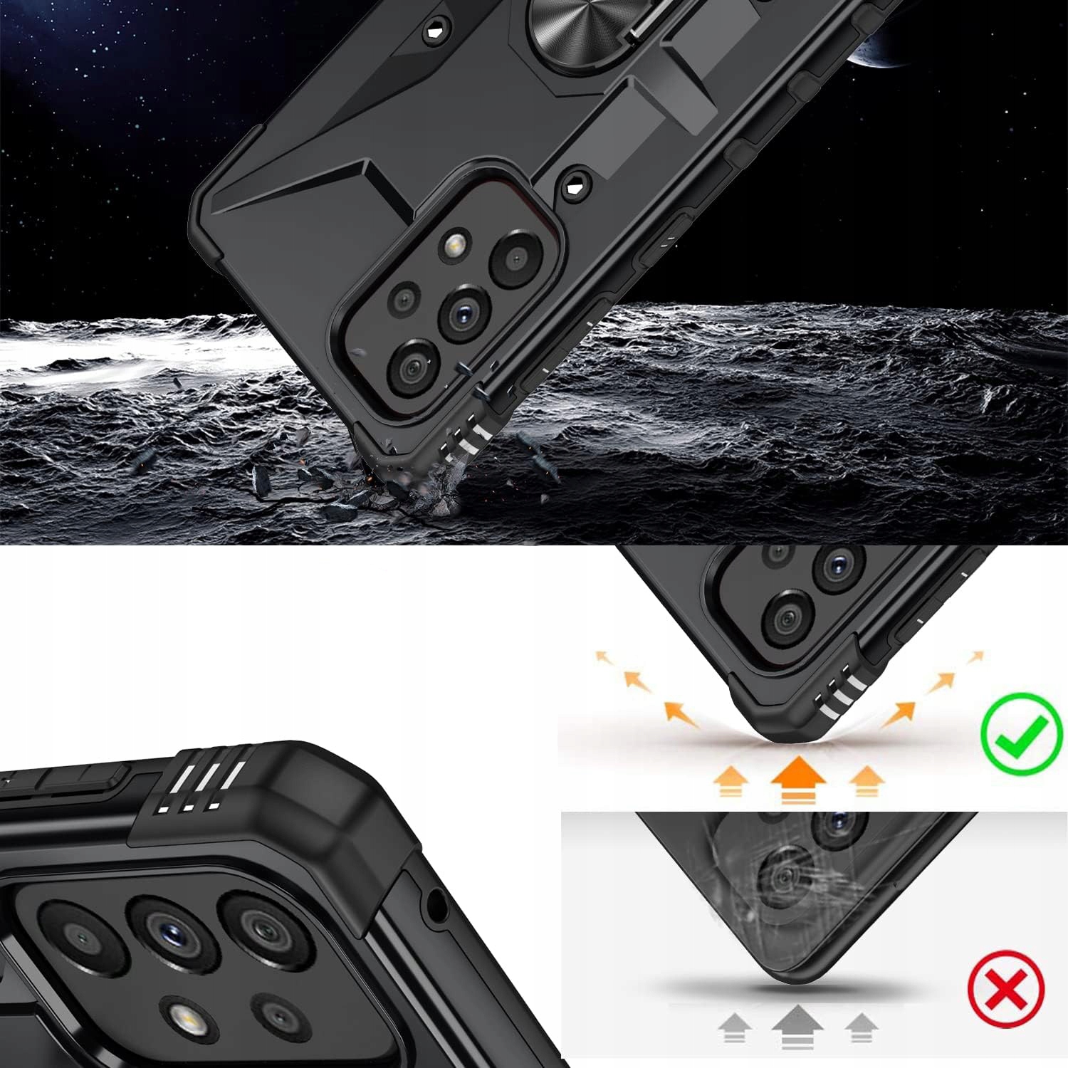 Pancerne etui to konstrukcja dwa w jednym z PC i TPU, z obudową PC, która jest mocna, trwała i odporna na wstrząsy , podszyte TPU, dobra elastyczność. Posiada pierścień do trzymania telefonu oraz blaszkę, dzięki czemu etui jest idealne do używania z magnetycznym uchwytem samochodowym.