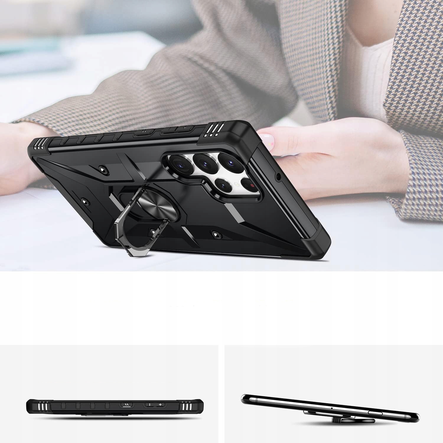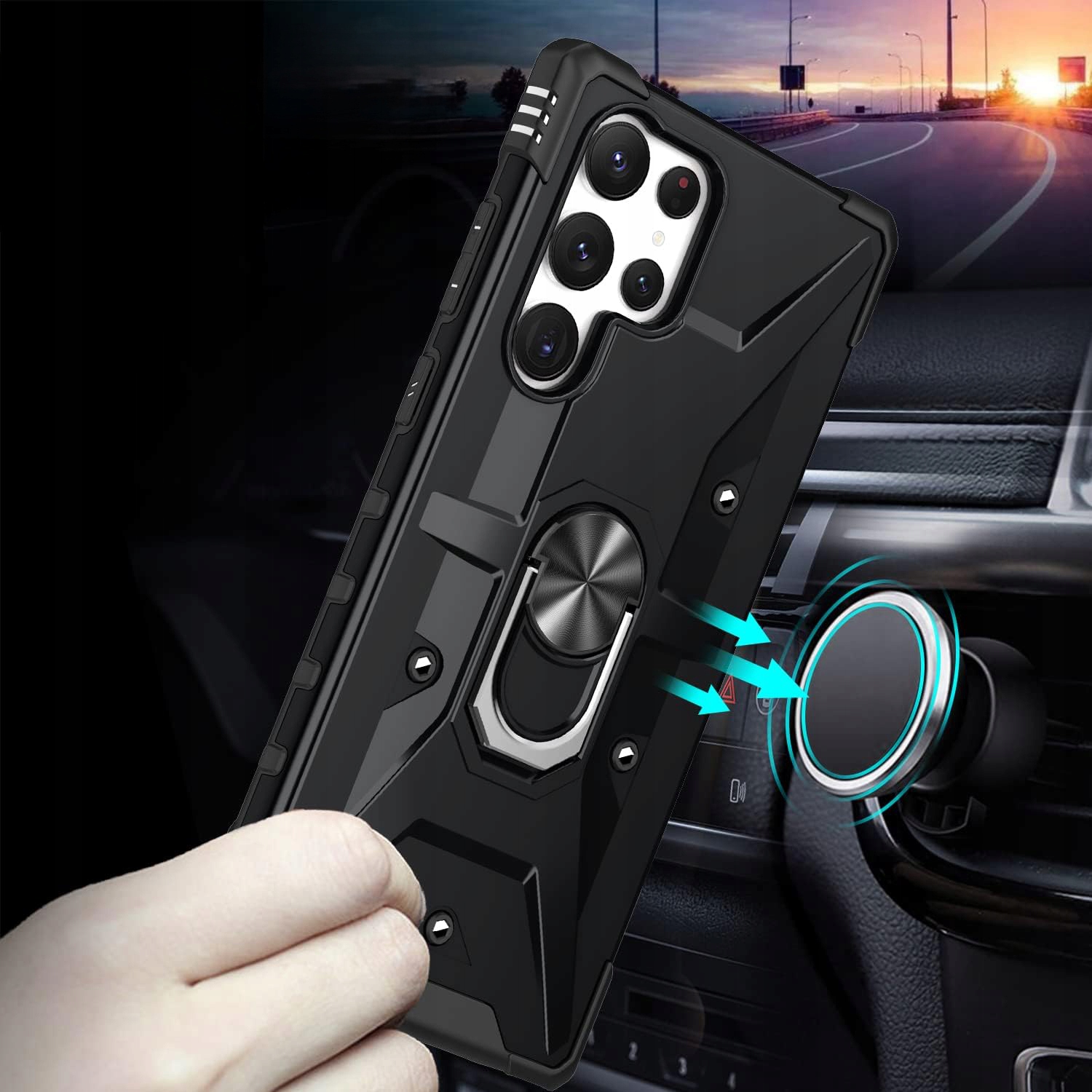 Pancerne etui to konstrukcja dwa w jednym z PC i TPU, z obudową PC, która jest mocna, trwała i odporna na wstrząsy , podszyte TPU, dobra elastyczność. Posiada pierścień do trzymania telefonu oraz blaszkę, dzięki czemu etui jest idealne do używania z magnetycznym uchwytem samochodowym.