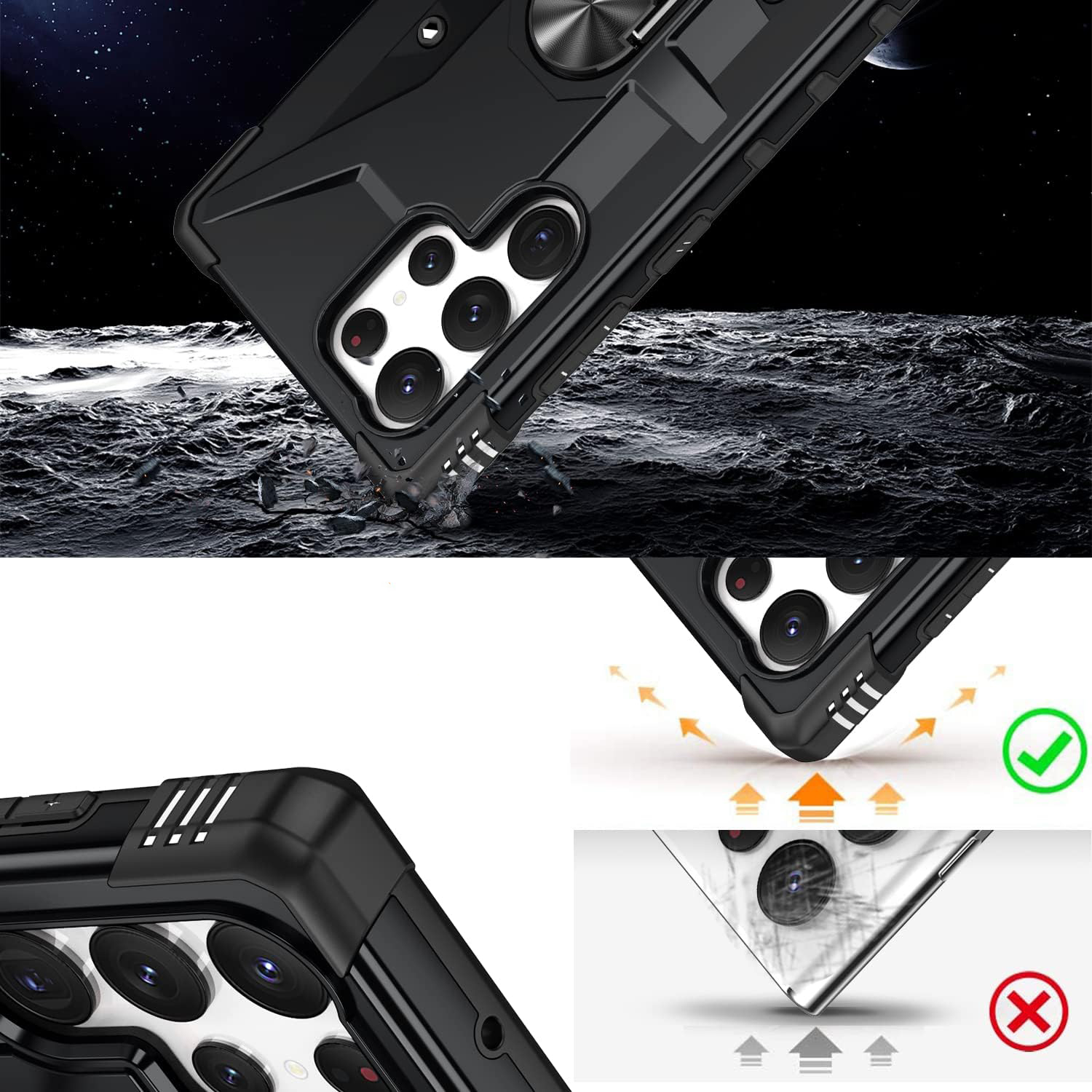 - Podwyższone krawędzie utrzymują aparat i ekran podniesione, aby zapobiec wstrząsom, kolizjom i zadrapaniom. Zapewnia pełną ochronę telefonu komórkowego podczas wszelkich czynności, szczególnie podczas pracy na świeżym powietrzu, uprawiania sportu, biwakowania, podróży itp.