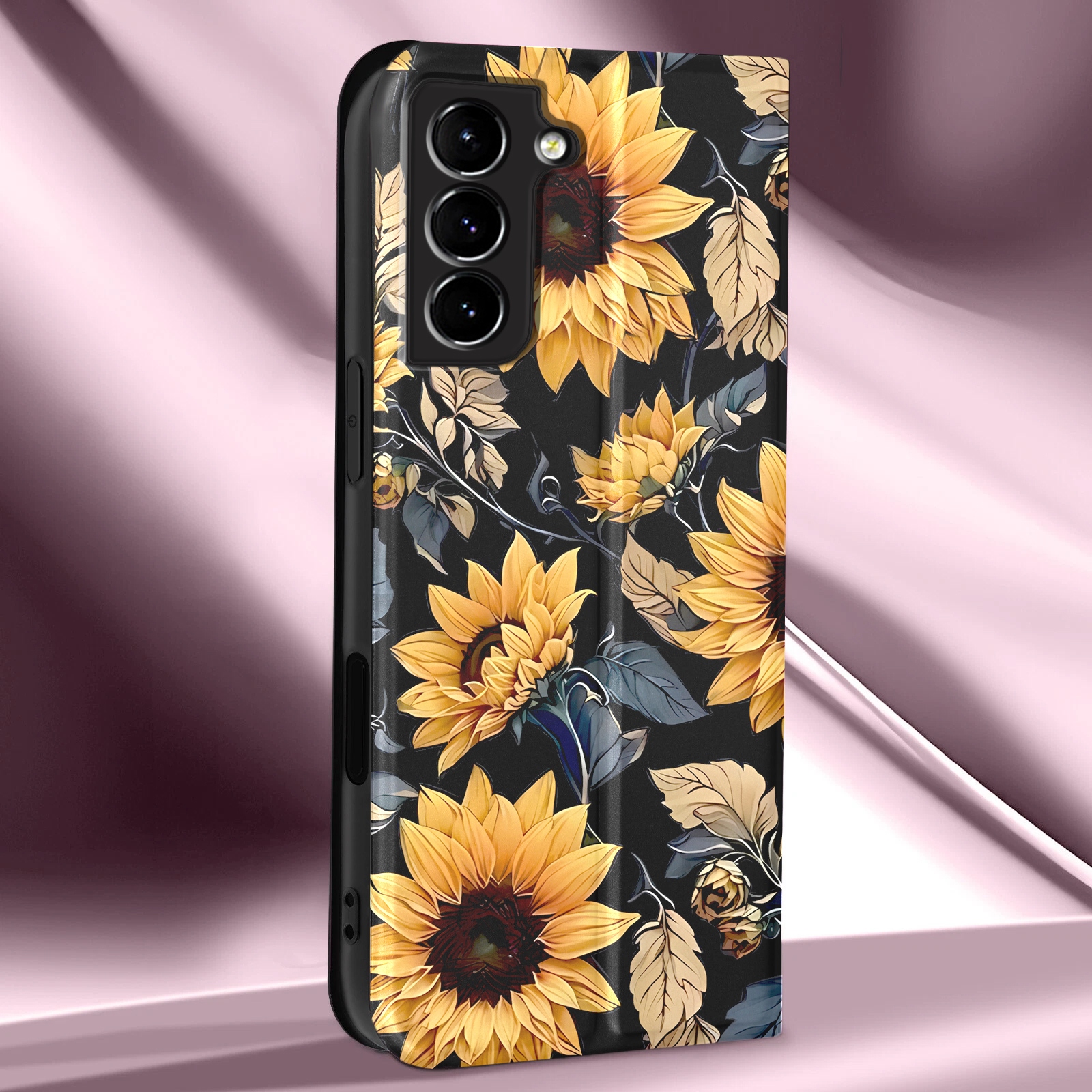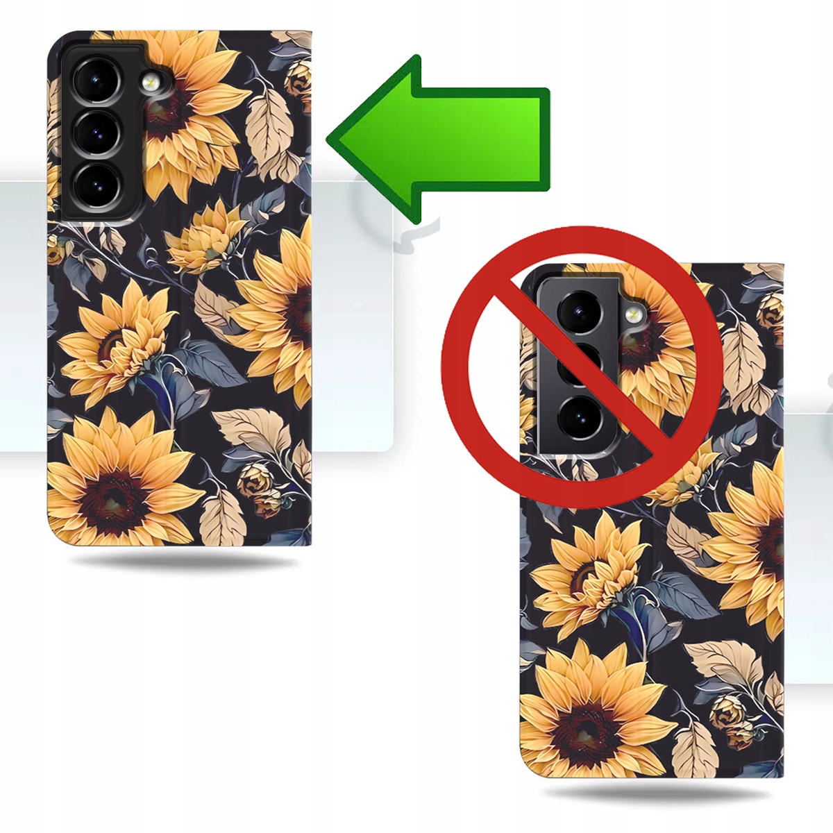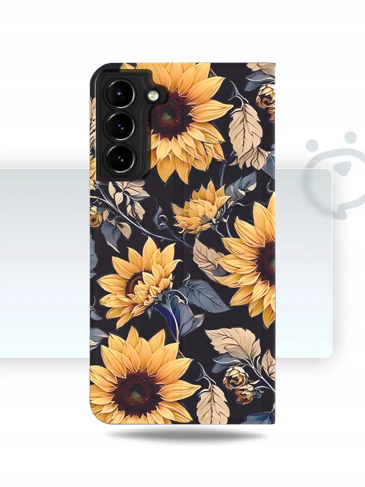 Stylowe , gładkie etui książkowe z pięknym nadrukiem słonecznika to idealne połączenie designu i funkcjonalności .