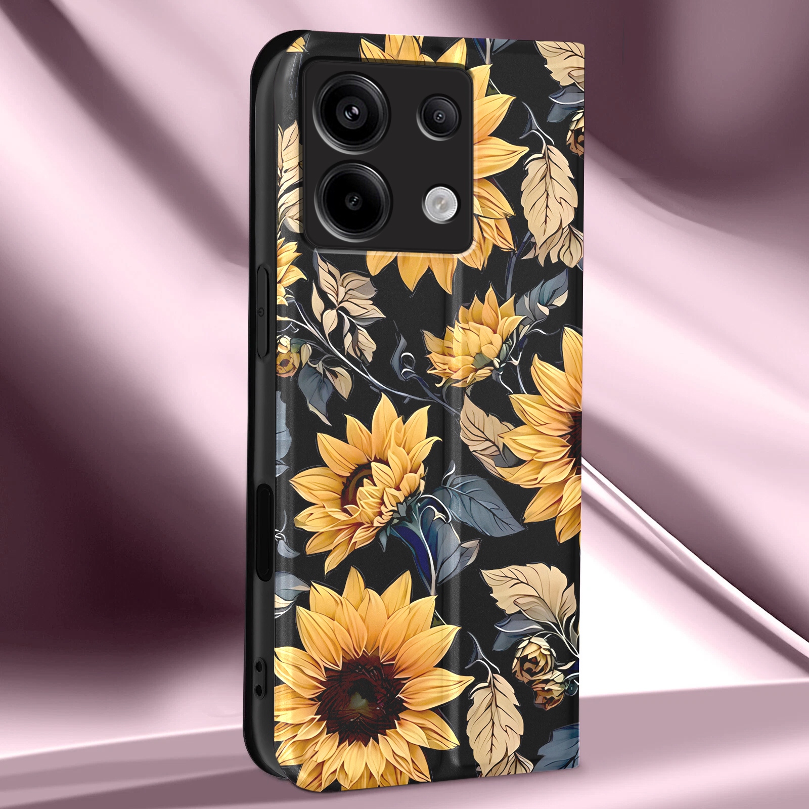 Stylowe , gładkie etui książkowe z pięknym nadrukiem słonecznika to idealne połączenie designu i funkcjonalności .