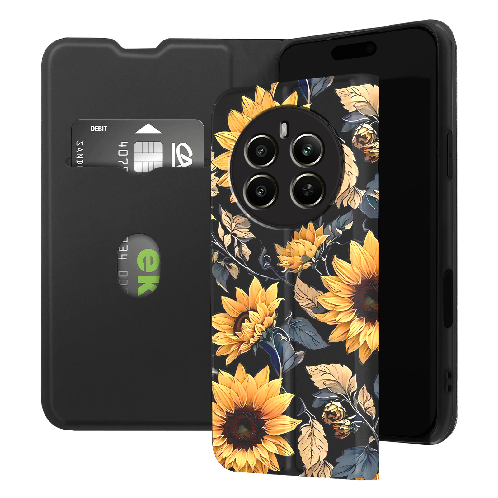 Stylowe , gładkie etui książkowe z pięknym nadrukiem słonecznika to idealne połączenie designu i funkcjonalności .