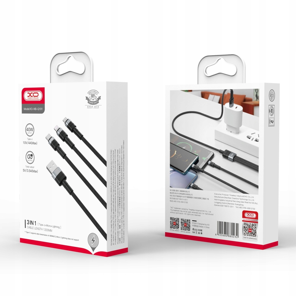 Kabel XO pozwala na szybkie ładowanie i synchronizację danych, dzięki nowoczesnym złączU. Wyjście na 3 końcówki pozwala na równoczesne ładowanie trzech urządzeń.