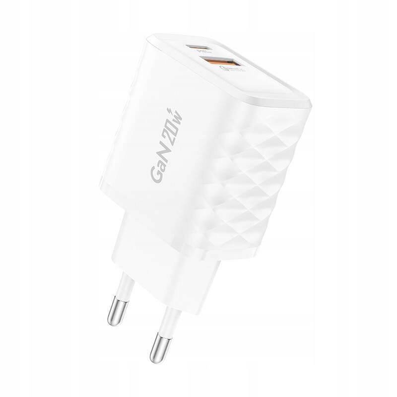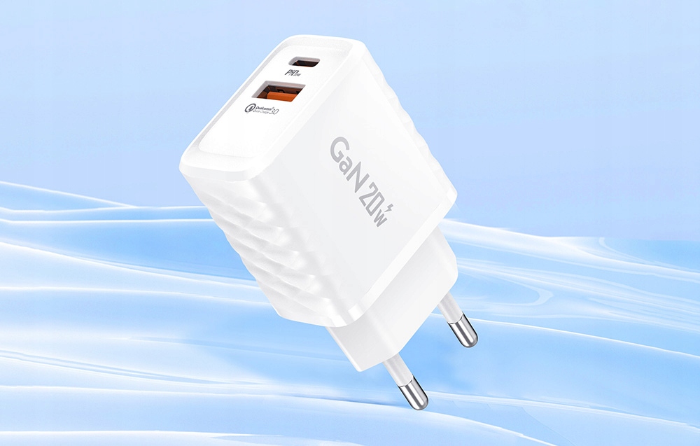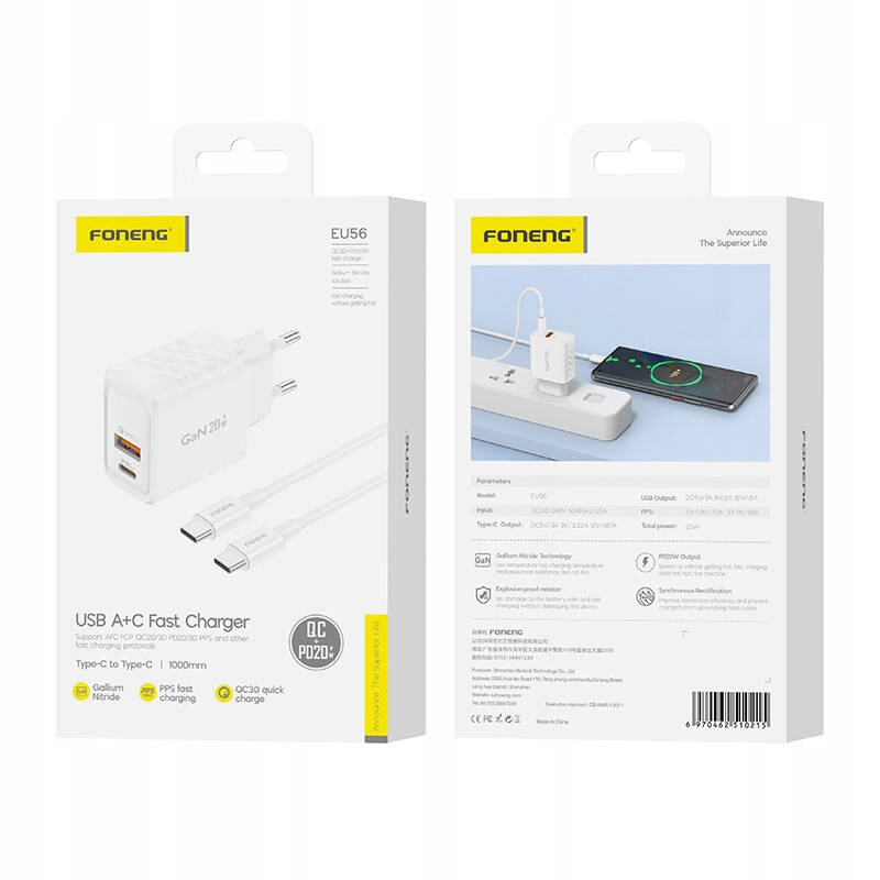 - Ładowarka sieciowa Foneng EU56 1xUSB-A, 1xUSB-C, 20W + kabel USB-C to zaawansowane urządzenie do szybkiego ładowania, które zapewnia maksymalną wydajność dzięki technologii GaN (azotku galu).