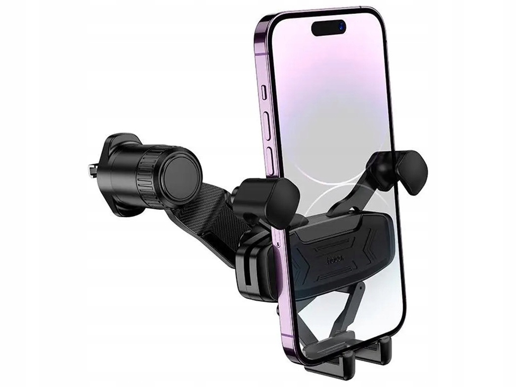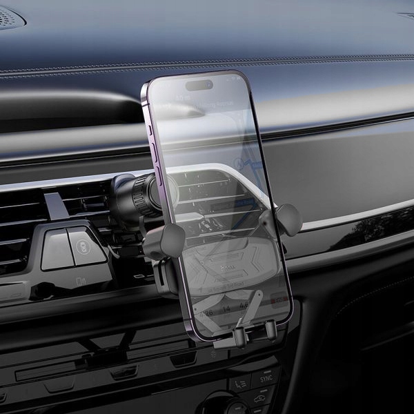 Uchwyt samochodowy wyposażony w mechanizm grawitacyjny, który automatycznie dopasowuje się do wielkości telefonu.